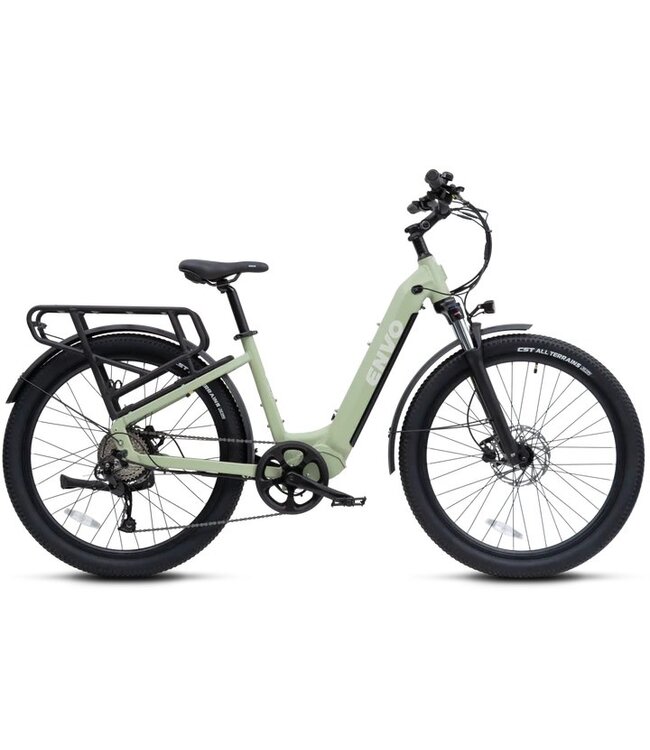ENVO ST50 GEN 2 is an e-bike that functions as a commuter and cargo carrier. Its rugged frame coupled with suspension fork allows for smooth rides on any terrain. Upgraded torque sensor, rear rack & fenders from GEN 1 version. Read more.