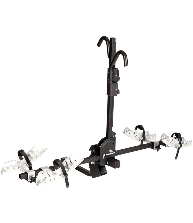The Swagman CHINOOK is a hitch mounted platform bike rack that will fit most sizes of bikes, wheels, and tire widths. A highly versatile and adjustable rack, it fits tires up to 3” wide and wheels that are 20” to 29” in diameter. If you have fatter tires, fat bike trays are sold separately. It has adjustable locking ratchet hooks which clamp the top tube and ratchet straps hold the wheels. Access the rear of your vehicle even when the bikes are loaded by tilting the rack back.